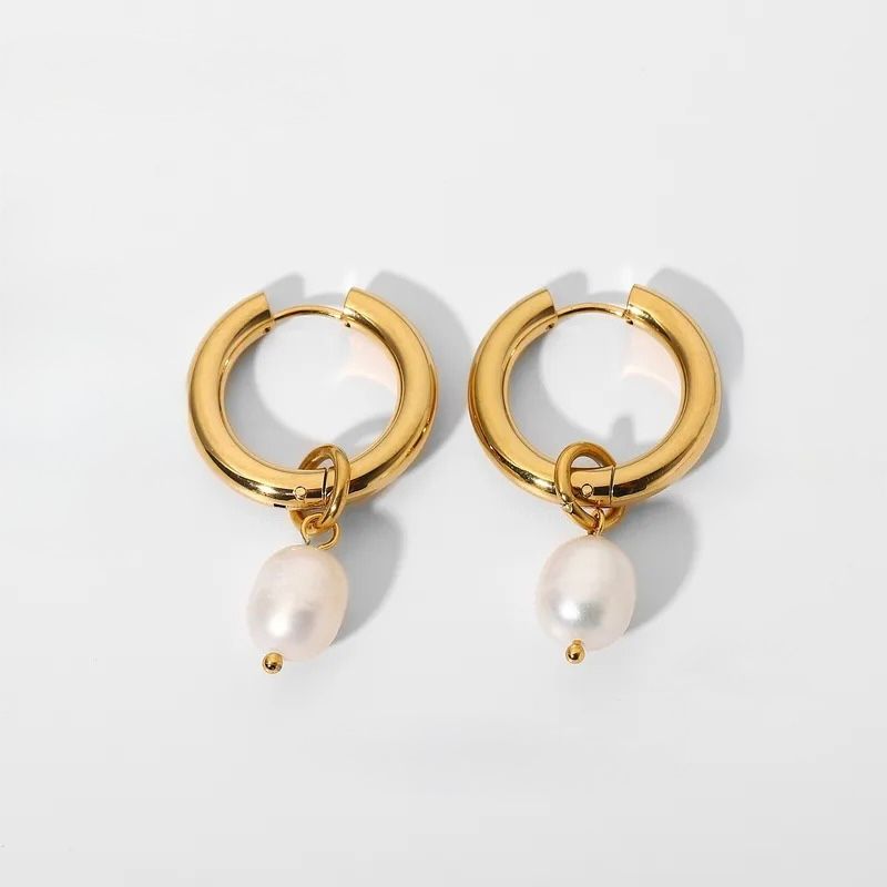 B19 - Arracadas con perla colgando. Color dorado. Acero inoxidable.