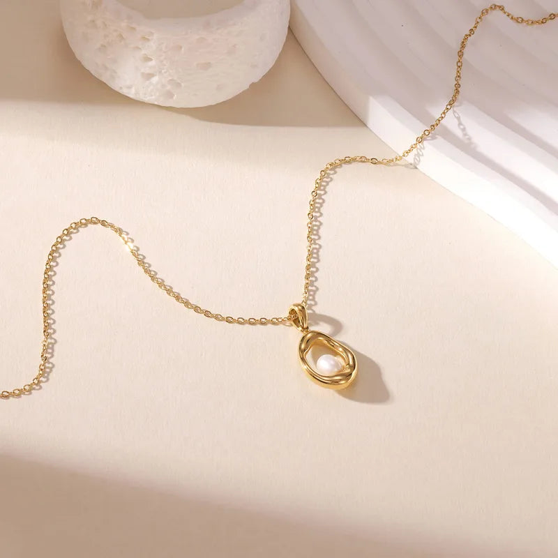 K02 - Collar con dije con perlita. Color dorado. Acero inoxidable.