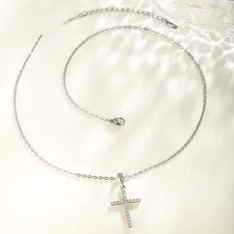 L14 - Collar con dije delgado de cruz con circonias. Color plateado. Acero inoxidable.