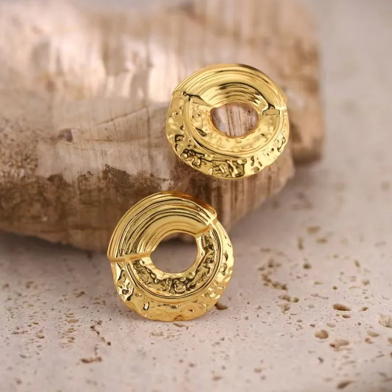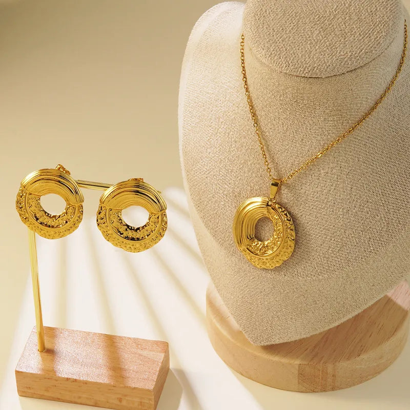 R05 - Juego aretes y collar forma redondo, tamaño mediano. Color dorado. Acero inoxidable.